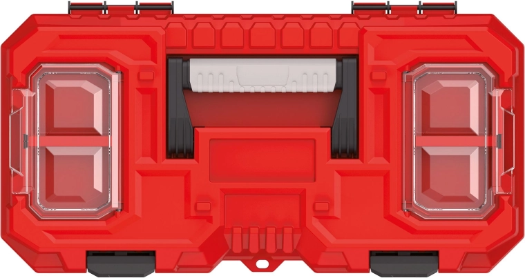 Kleine schroeven, bits en pluggen blijven overzichtelijk gesorteerd en direct beschikbaar dankzij twee aparte vakken met transparante deksels.