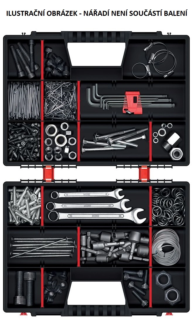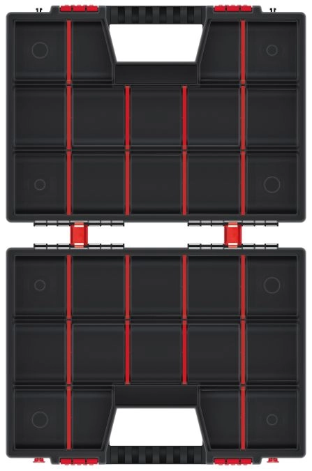De binnenruimte pas je eenvoudig aan met de uitneembare tussenschotten – creëer precies de vakken die je nodig hebt. Robuust kunststof, dubbele sluitingen en naar elkaar toegekeerde deksels houden alles veilig op zijn plek, ook tijdens het dragen.
