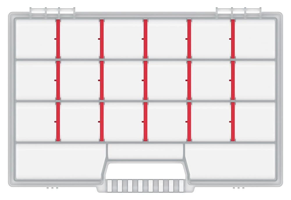 Een variabele indeling wordt mogelijk gemaakt door uitneembare schotjes, zodat je de grootte van de vakken eenvoudig aanpast aan je actuele behoeften. Het stevige handvat zorgt voor comfortabel en veilig dragen bij werkzaamheden thuis, in de garage en onderweg.