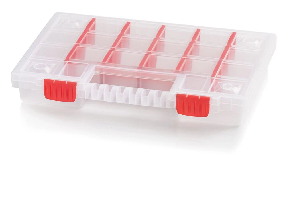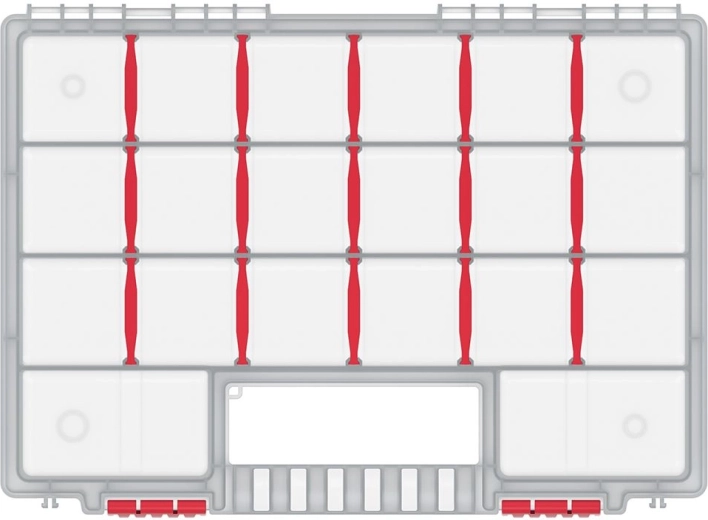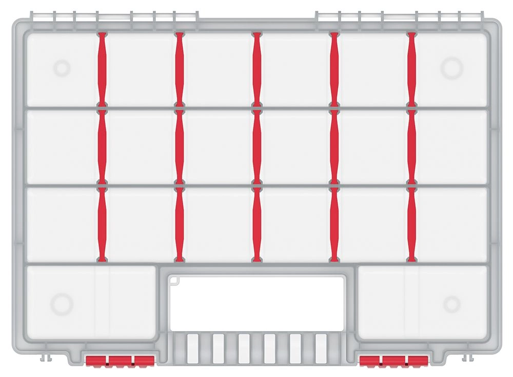 Praktische kunststof organizer NORT met 22 vakken, ideaal voor het overzichtelijk opbergen van schroeven, moeren, ringen of pakkingen. Dankzij de uitneembare verdelers pas je de binnenruimte eenvoudig aan je behoeften aan, terwijl het transparante deksel snel zicht biedt op de inhoud zonder te openen. Licht, maar met een duurzame constructie, een stevige handgreep en robuuste clips voor veilig en comfortabel dragen thuis, in de werkplaats en op locatie.