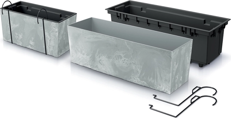 Elegante plantenbak met een modern betoneffect in de tint marengo, ideaal voor balkon en tuin. Gemaakt van hoogwaardige kunststof die licht is, UV-bestendig en vorstbestendig tot -32 °C. Inclusief een praktische inzet voor eenvoudig planten en haken voor ophanging voor een veilige bevestiging aan balustrade of hek.