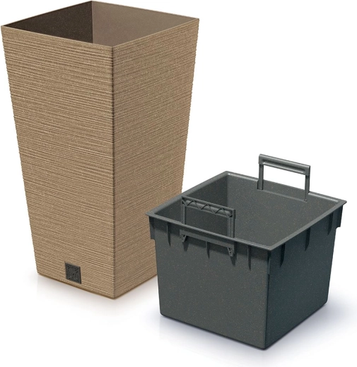 De bloempot Furu Square Eco Wood in de kleur naturo combineert een elegante, conische vorm met een gestructureerd oppervlak geïnspireerd op gevlochten rotan. Past bij zowel een moderne als natuurlijke woonstijl en accentueert siergrassen, kruiden en kamerplanten. De geïntegreerde, uitneembare inzet met handgrepen vergemakkelijkt verplanten, water geven en het verplaatsen van planten.