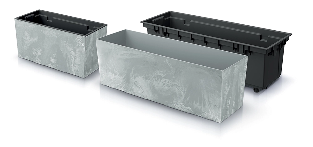 Elegante bloembak URBI CASE met een lengte van 58 cm in grijs betoneffect combineert modern design en praktische functionaliteit. Hij is licht, bestand tegen UV-straling en vorst tot -32 °C en dankzij de inzet wordt planten en onderhoud eenvoudiger. Ideaal voor vensterbanken, balkons en terrassen.
