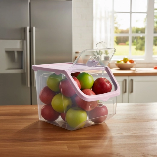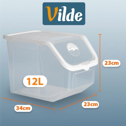 Praktische en hygiënische container voor het organiseren van voorraadkast en aanrecht. Dankzij de transparante wanden heeft u altijd zicht op de voorraad; de voorste uitklapklep zorgt voor gemakkelijk doseren en het afsluitende deksel beschermt tegen vocht en geuren. Ideaal voor fruit, groenten (uien, aardappelen, knoflook), diervoer en bijvoorbeeld meel of peulvruchten.