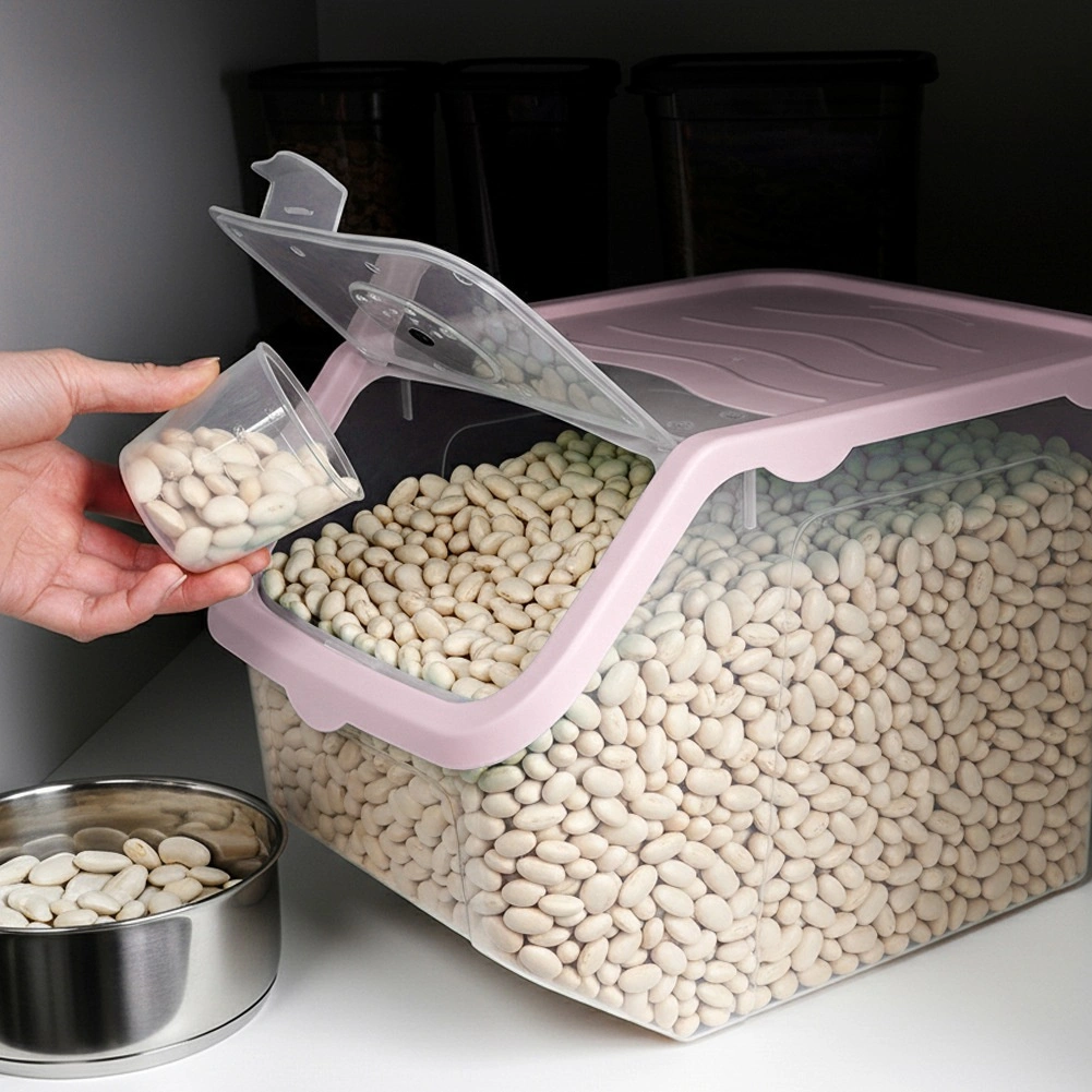 Het uitklapbare deurtje met handgreep maakt het mogelijk de benodigde hoeveelheid te nemen zonder het deksel te verwijderen. Ideaal voor dagelijks gebruik en voor orde in de voorraadkast.