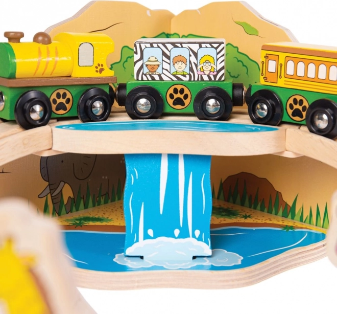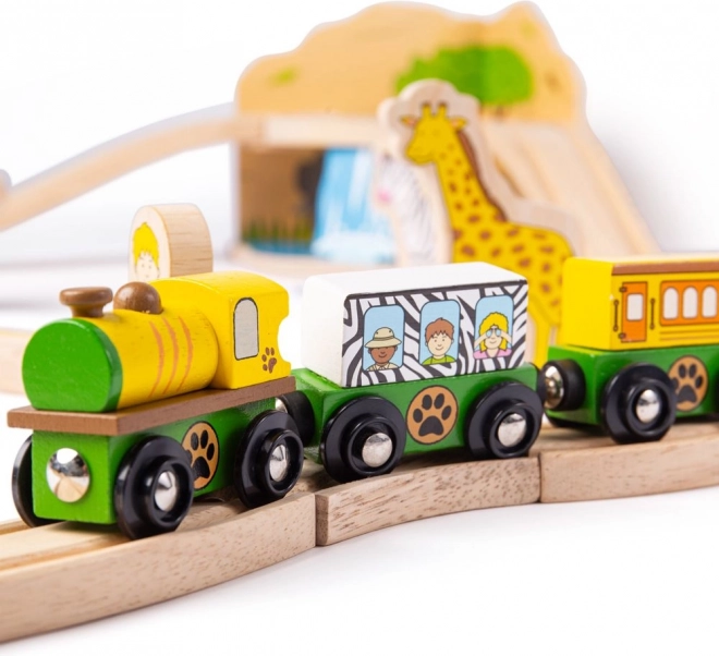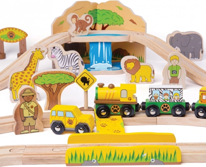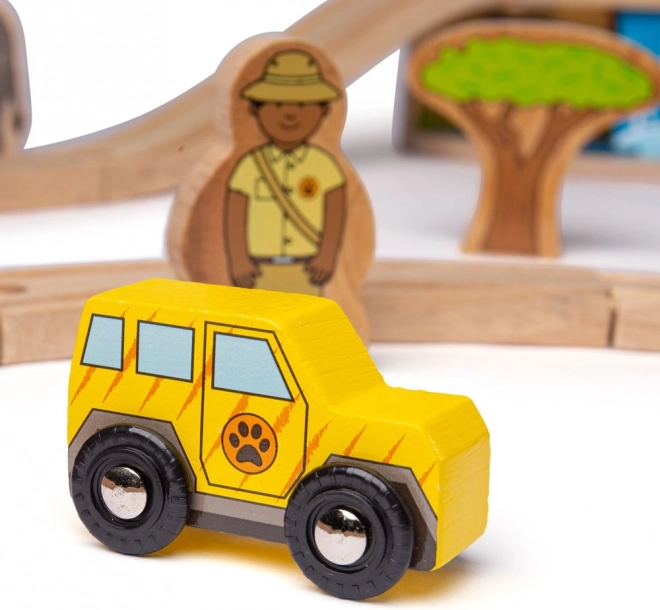 Ontdek de safariwereld met een kleurrijke en stevige houten treinbaan die kinderen vanaf 3 jaar zal bekoren. De set bevat dieren zoals een olifant, zebra en aap, boompjes, bordjes en een brug waarover de gele locomotief met twee wagonnetjes rijdt. Dankzij de magnetische koppelingen is het spel intuïtief en uit te breiden.