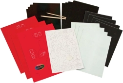 • Inhoud van de set: 16 krasafbeeldingen (ca. 21,5 × 14 cm), 2 houten pennen, sjablonen, 3 standaards voor presentatie.