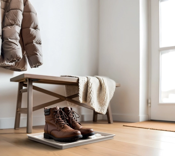 Gebruik hem als afdruipmat voor natte schoenen, als stabiele basis onder bakjes met voer en water of als schoon werkoppervlak bij het verpotten van planten. Dankzij het universele design past hij in verschillende interieurs en helpt hij orde te houden.