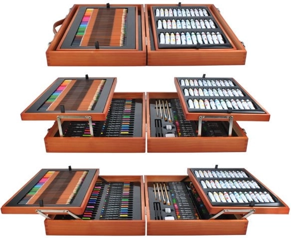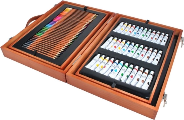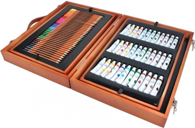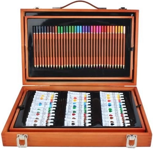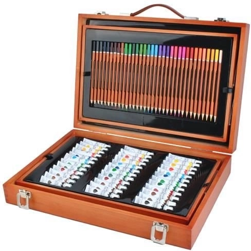 Verrijk je artistieke uitrusting met deze geweldige schilderkit met kleurpotloden, markers, aquarellen en olieverven. Krijg kwaliteit en duurzaamheid dankzij de stevige houten koffer met praktische handgreep en sluitingen voor gemakkelijk transport en veilige opslag. Ieder element heeft zijn plek, wat garandeert dat alles georganiseerd en klaar voor gebruik blijft.