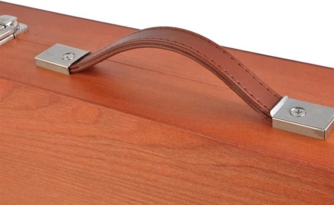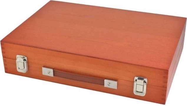 Stabiele en stijlvolle koffer met een afwerking van gepolijst hout biedt ruimte voor veilige opslag van alle hulpmiddelen.