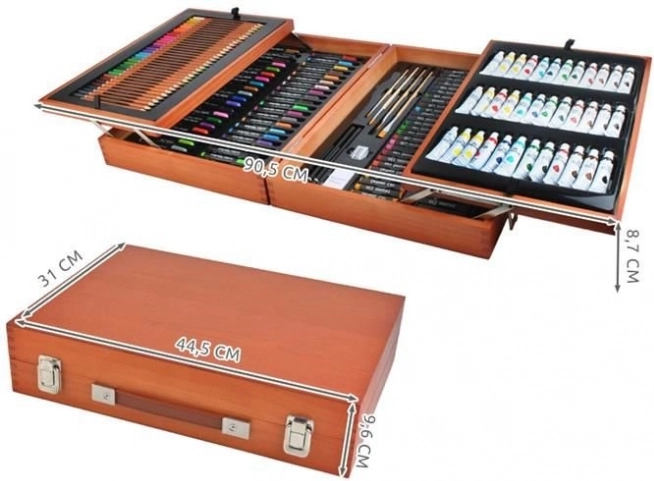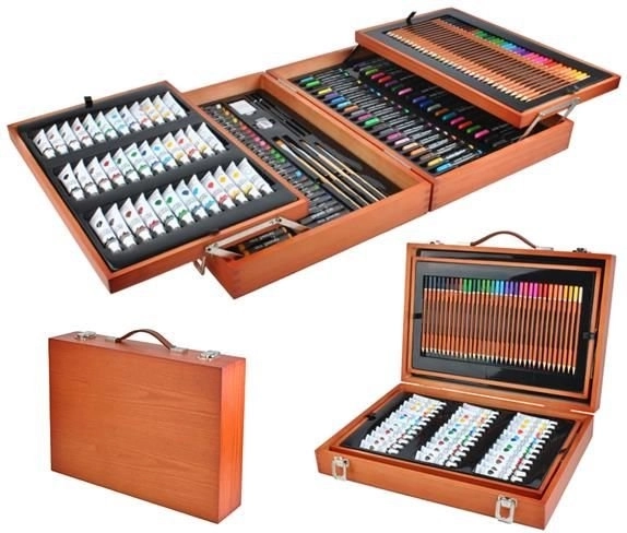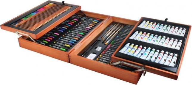 Grote tekenset met 177 stuks, ideaal voor kleine en grote kunstenaars. Dankzij de stevige houten koffer met sluitingen blijft alles op zijn plaats, wat zorgt voor een veilige transport.