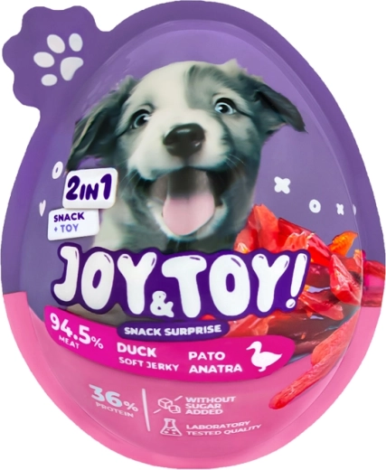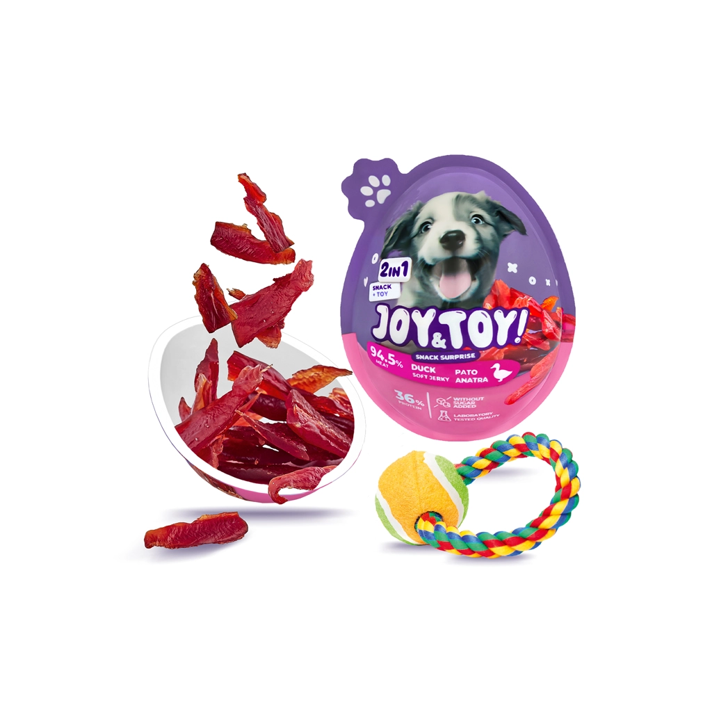 Ontdek plezier en beloning in één: Joy&Toy ei bevat zachte eendenjerky en verrassingsspeelgoed voor je hond. De snack bestaat uit 94,5% eendenborst, zacht gedroogd en zonder kleurstoffen, suiker en smaakversterkers. In elke verpakking zit een ander speelgoedmodel – meer dan 100 mogelijkheden voor actief spel en plezier.