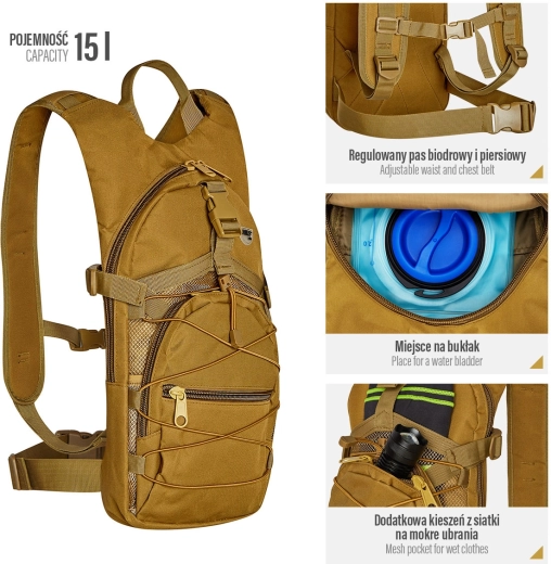 Het hoofdvak heeft een scheidingswand en twee karabiners voor het ophangen van een waterzak (niet inbegrepen). De slang kun je handig rechts of links uitvoeren. Daarnaast is er een groot gaasvak met band en gesp, een kleiner open gaasvak, een extra vak met rits en een veilig ritsvak. Het externe elastische koord met cordlock houdt een helm of slaapmat op zijn plaats, terwijl compressieriemen de lading stabiliseren.
