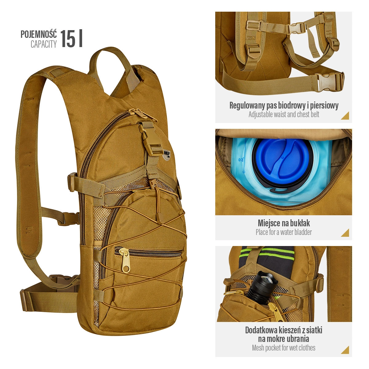 • Voorbereid voor drinksysteem met doorvoer aan beide zijden en slanghouders op de schouderbanden.