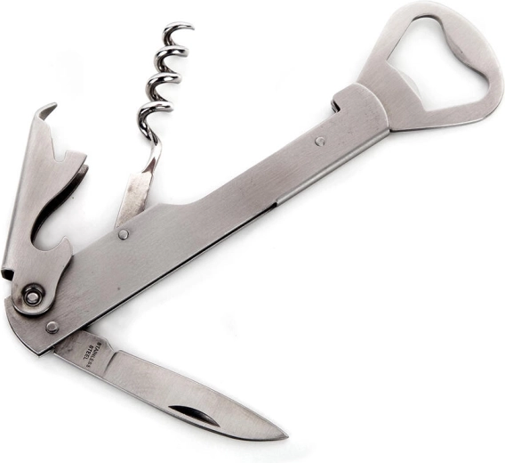 Praktische kelnersopener in een robuuste uitvoering voor het moeiteloos openen van wijn en bier. Combineert een kurkentrekker en hefboom voor kurken met een kroonkurkopener, is gemaakt van duurzaam roestvrij staal en ligt uitstekend in de hand. Ideaal voor thuis en in de horeca. Universeel gebruik, hoogwaardig roestvrij staal, comfortabele bediening.