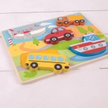 Leuke houten inlegpuzzel met vervoersmiddelen voor de allerkleinsten. Bevat 5 grote stukjes met knopjes, die kinderen gemakkelijk in de juiste uitsparingen plaatsen. Ondersteunt fijne motoriek, coördinatievaardigheden, leren van vormen en kleuren en woordenschatontwikkeling. Gemaakt van hoogwaardig hout en voldoet aan de Europese veiligheidsnormen.
