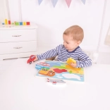 Vijf kleurrijke stukjes (vliegtuig, auto, bus, vrachtwagen en boot) helpen kinderen spelenderwijs hun woordenschat uit te breiden en vormen en kleuren te herkennen.