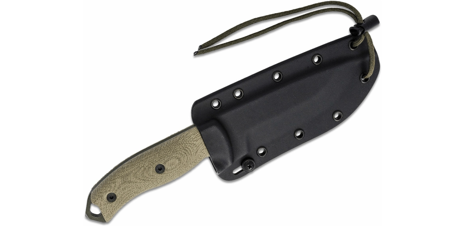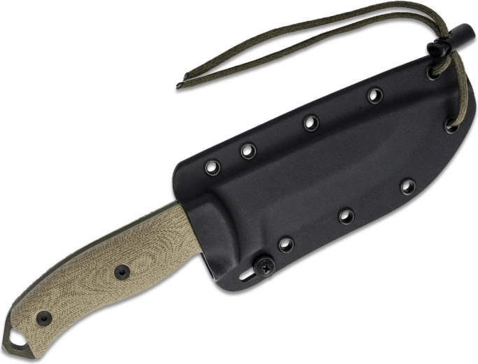 Het getextureerde Micarta handvat in het groen ligt zeker in de hand, ook bij natte omstandigheden. Een koordoog voor paracord vergroot de mogelijkheden voor zekeren of ophangen. De set bevat een zwarte Kydex riemschede, die snelle toegang en veilige opberging van het mes garandeert.