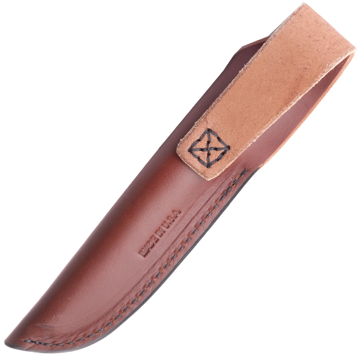 Getextureerde schalen van Micarta in de tint Tan zorgen voor een comfortabele, zekere greep, ook met handschoenen. De lederen schede met riemlus maakt veilig en stijlvol dragen mogelijk, zowel in het veld als in de stad.