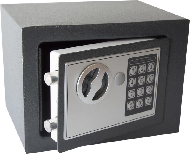 Praktische digitale kluis met stalen constructie, ideaal voor het opbergen van documenten, sieraden, contant geld en andere kostbaarheden. De compacte afmetingen 230 × 170 × 170 mm maken onopvallende plaatsing in een kast, lade of op een plank mogelijk, of stevige verankering voor extra veiligheid.