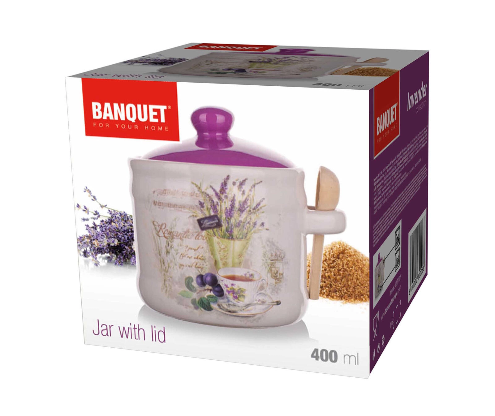 Stijlvolle keramische voorraadpot met een inhoud van 400 ml in LAVENDER-design, ideaal voor suiker, zout of kruiden. Dankzij het goed sluitende deksel en het meegeleverde houten lepeltje biedt het een praktische en esthetische opslagoplossing. Keramische uitvoering, praktisch houten lepeltje en subtiele lavendeldecoratie maken je keuken tot in de puntjes af.