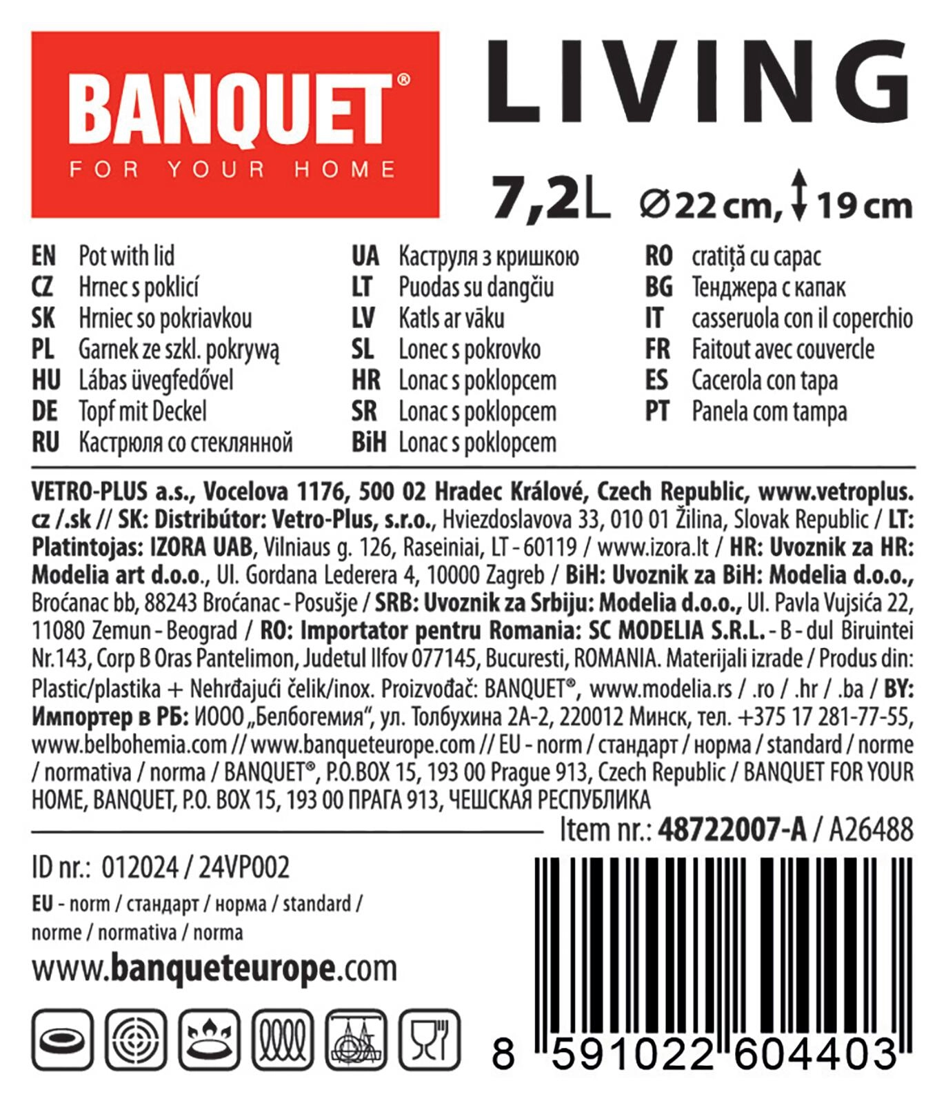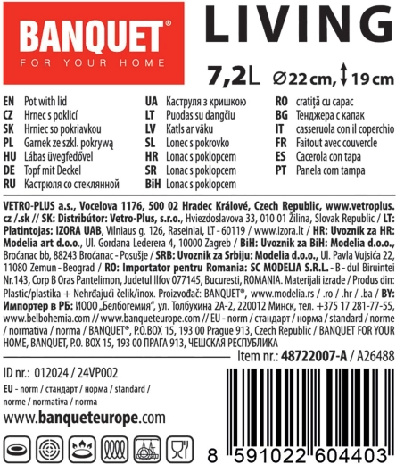 Praktische roestvrijstalen pan LIVING met een inhoud van 7,2 l en een diameter van 22 cm, ideaal voor het koken van soepen, sauzen en pasta. Voorzien van een glazen deksel met roestvrijstalen knop, geschikt voor alle soorten kookplaten, inclusief inductie, en duurzame RVS-uitvoering met een glanzend oppervlak en drie matte ringen voor een elegante uitstraling.