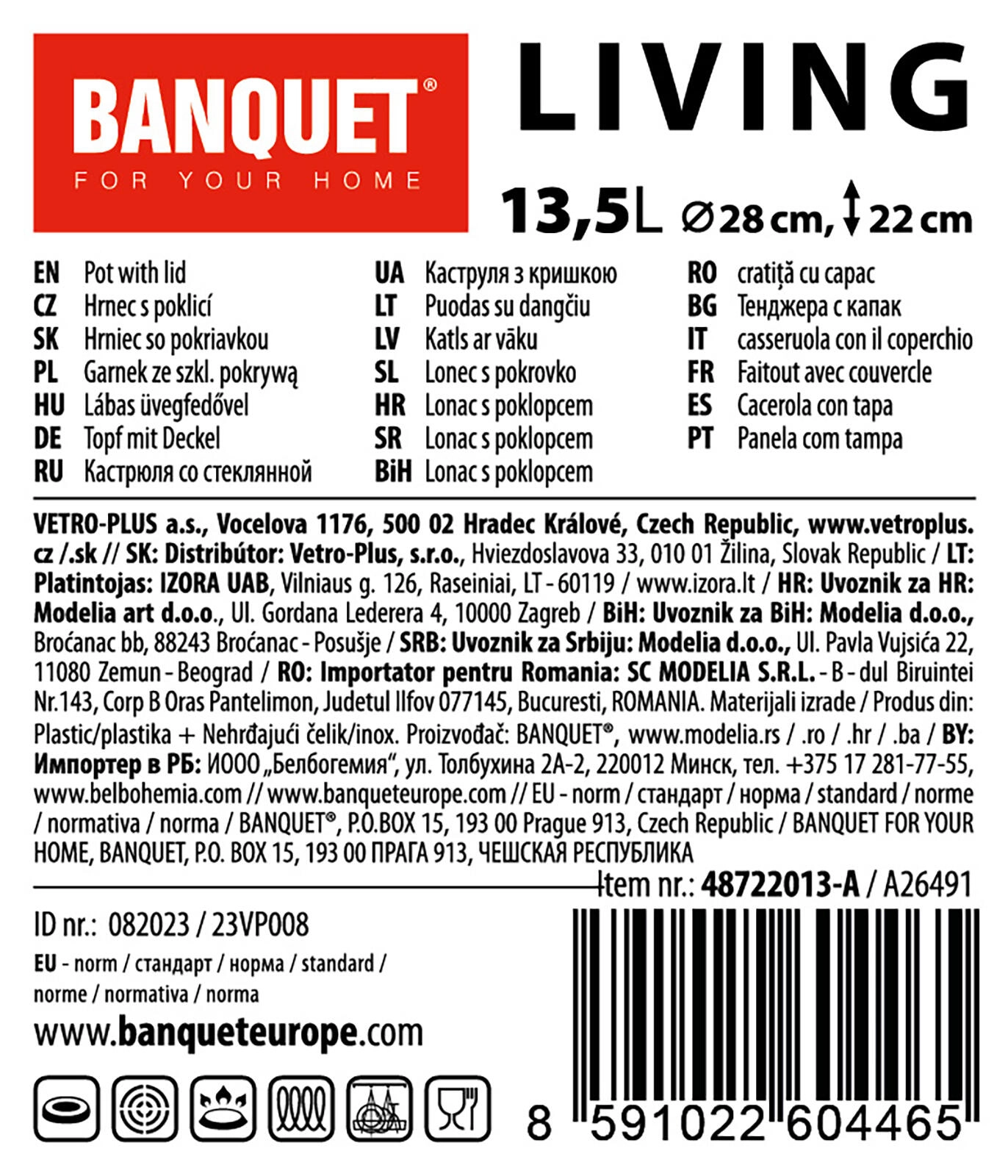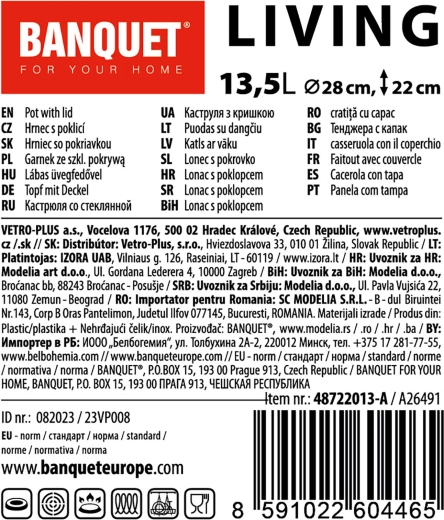 Ruime roestvrijstalen pan LIVING met een inhoud van 13,5 l en een glazen deksel is ideaal voor het koken van soepen, bouillons en grotere porties. Biedt een diameter van 28 cm, hoogwaardige rvs 201, glazen deksel met rvs knop en compatibiliteit met alle soorten kookplaten, inclusief inductie.