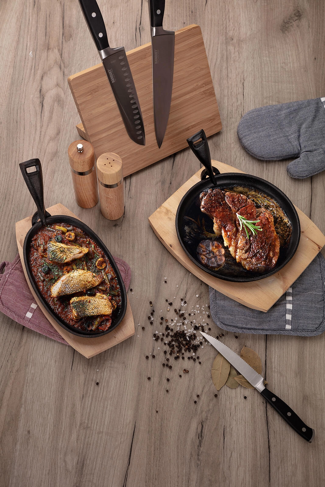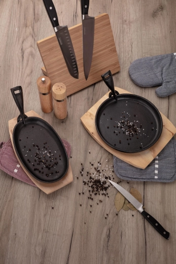 De gietijzeren pan houdt warmte vast en met de houten plank zet je haar veilig op tafel – het eten blijft heet en verleidelijk sissend.