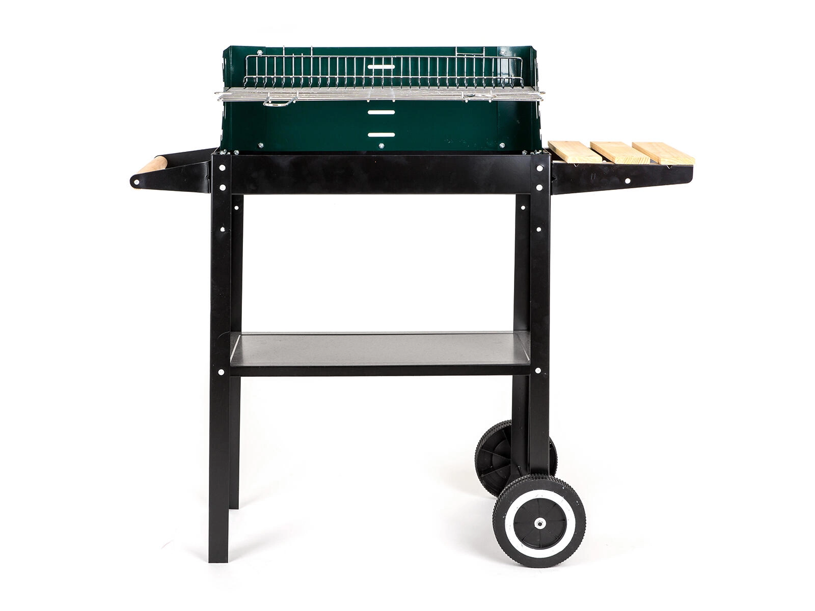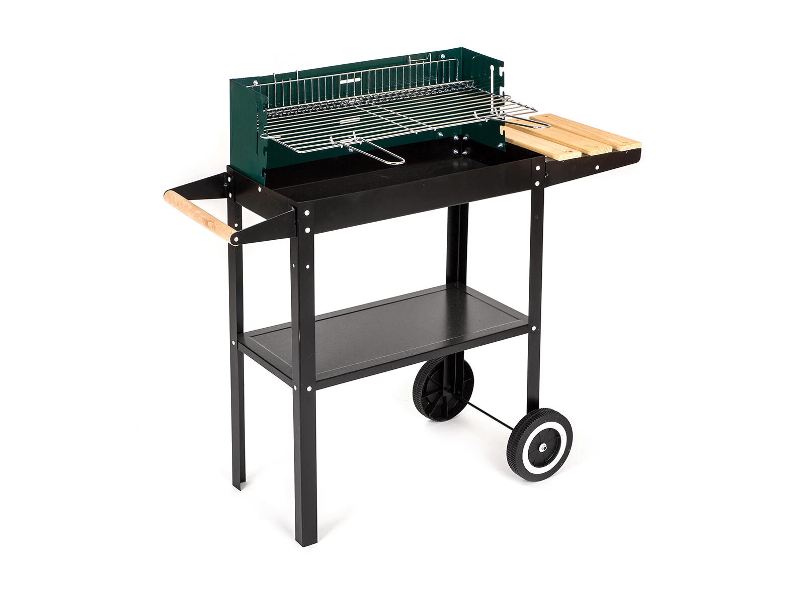 Robuuste tuinbarbecue op houtskool met transportwielen en een verstelbare vuurhaard voor perfecte temperatuurcontrole. Voorzien van een verchroomd grillrooster en een verchroomd warmhoudrek voor gemakkelijk parkeren en opwarmen van gerechten, ideaal voor grillen op terras en in de tuin.