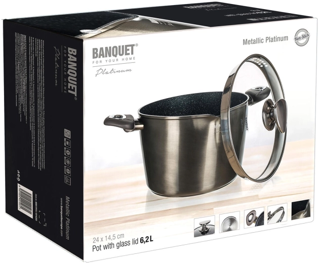 Robuuste gegoten aluminium pan METALLIC PLATINUM met een inhoud van 6,2 l en een diameter van 24 cm biedt een antiaanbaklaag met hoge slijtvastheid, een volledig inductiebodem voor snel opwarmen en een praktische schenktuit voor eenvoudig afgieten. Het glazen deksel met ventiel maakt kookcontrole mogelijk, terwijl de soft-touch handgrepen en de roestvrijstalen knop zorgen voor comfortabele en veilige hantering.
