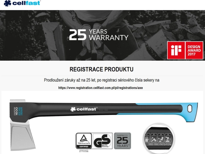 Het antislipoppervlak SAFETOUCH bedekt een groot deel van de handgreep, waardoor de bijl ook onder zwaardere omstandigheden uitstekend in de hand ligt. De gebalanceerde constructie verhoogt de trefzekerheid en de algehele veiligheid. De multifunctionele bladhoes zorgt voor veilig transport en opslag. Op producten van het merk CELLFAST geldt de wettelijke garantie van 2 jaar; voor bijlen kan de garantie na registratie worden verlengd tot 25 jaar.