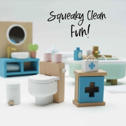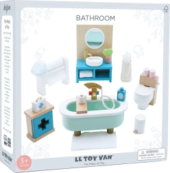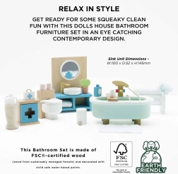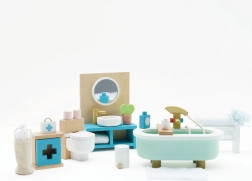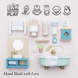 Stijlvolle set badkamermeubilair voor een poppenhuis op schaal 1:12 van het merk LE TOY VAN. Bevat een bad, toilet, wastafel, handdoekenrek en medicijnkastje, met de hand nabewerkt met niet-giftige verf op waterbasis. Gemaakt ethisch van duurzame materialen, ondersteunt creatief spel, communicatieve vaardigheden en coördinatie.
