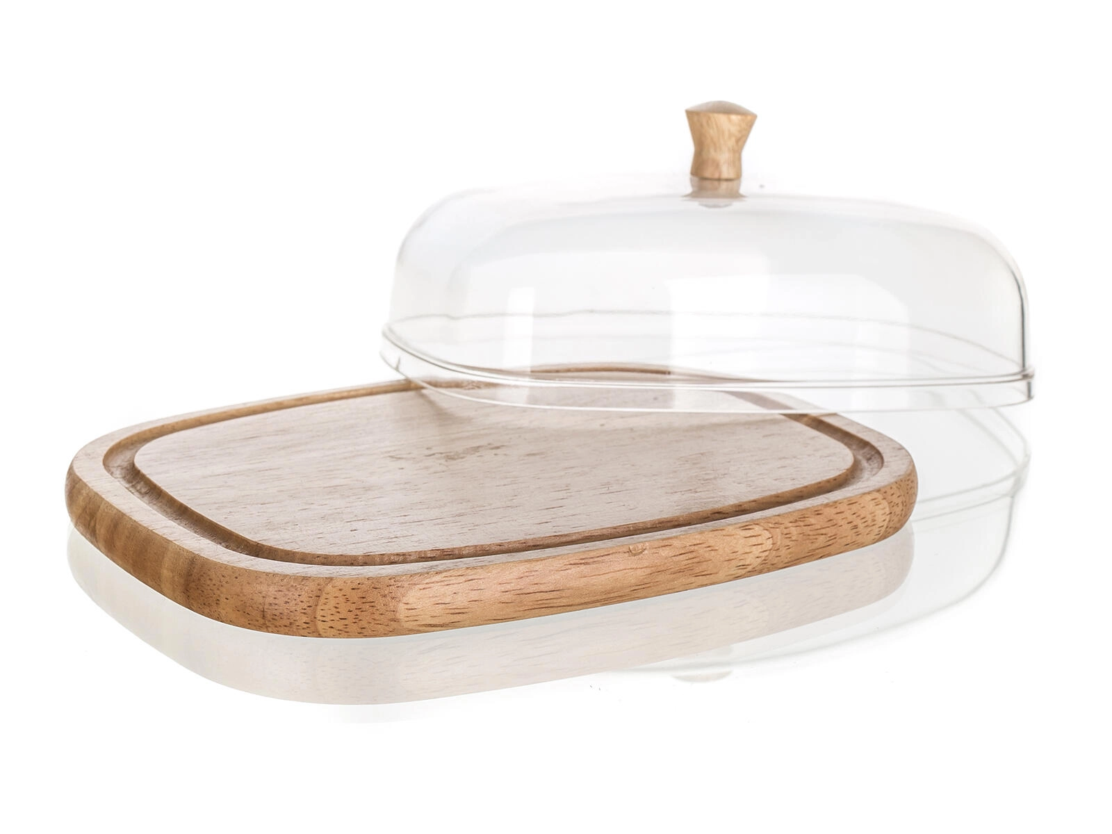 Stabiel rubberhout met een omlopende groef fixeert de stolp stevig en geeft het serveren een elegante uitstraling.