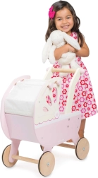 Stijlvolle houten poppenwagen Sweet Dreams van LE TOY VAN in pastelroze, met een traditionele uitstraling en hoogwaardige afwerking. Biedt een stevige constructie, een zacht matras, een met de hand genaaide uitschuifbare hemel en stille rubberen wielen voor soepel rijden op zowel tapijt als harde vloeren. Inclusief een schattige luiertas. Ethisch geproduceerd van FSC-hout en geverfd met niet-giftige verf.