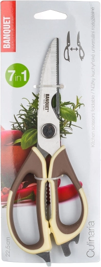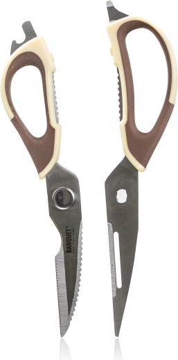 Praktische universele keukenschaar van 22,5 cm die uit elkaar kan worden gehaald voor eenvoudig reinigen en multifunctioneel gebruik. Voorzien van vlijmscherpe roestvrijstalen bladen, ergonomische beige‑bruine handgrepen en geïntegreerde tools voor het openen van flessen, het kraken van noten en het snijden van gevogelte.