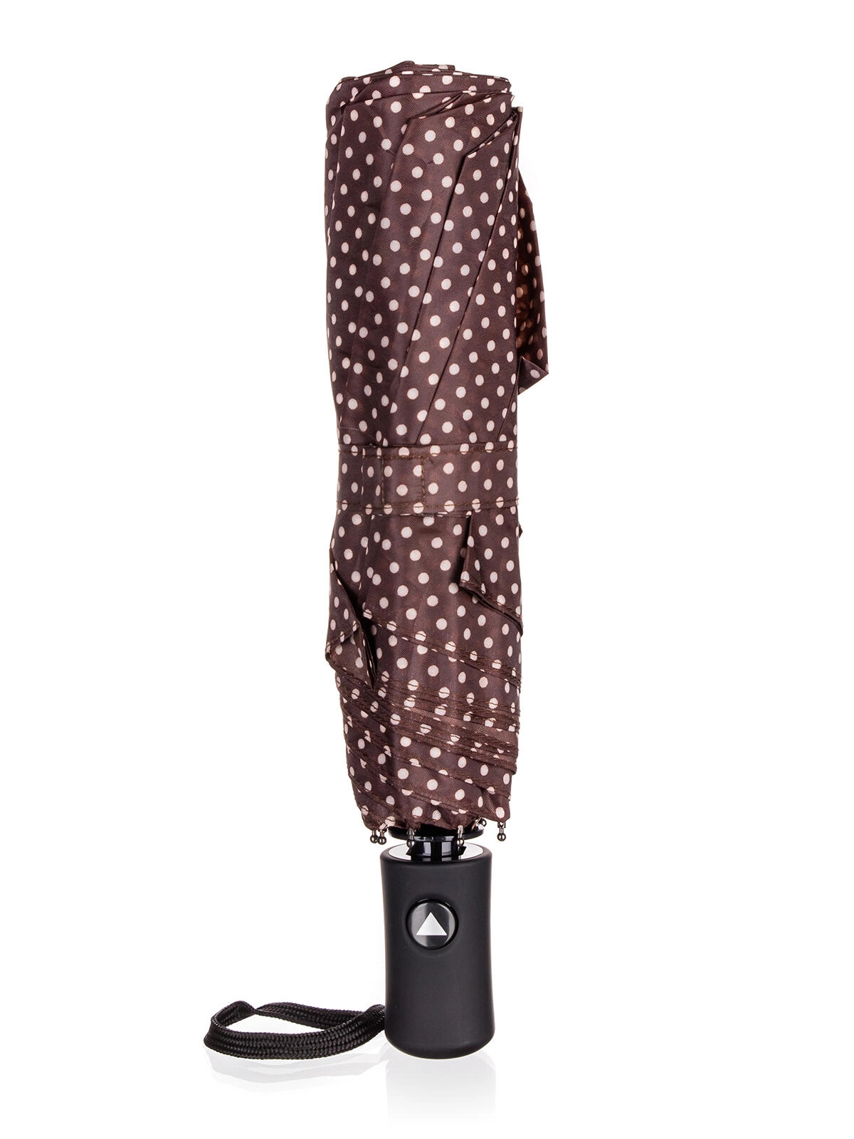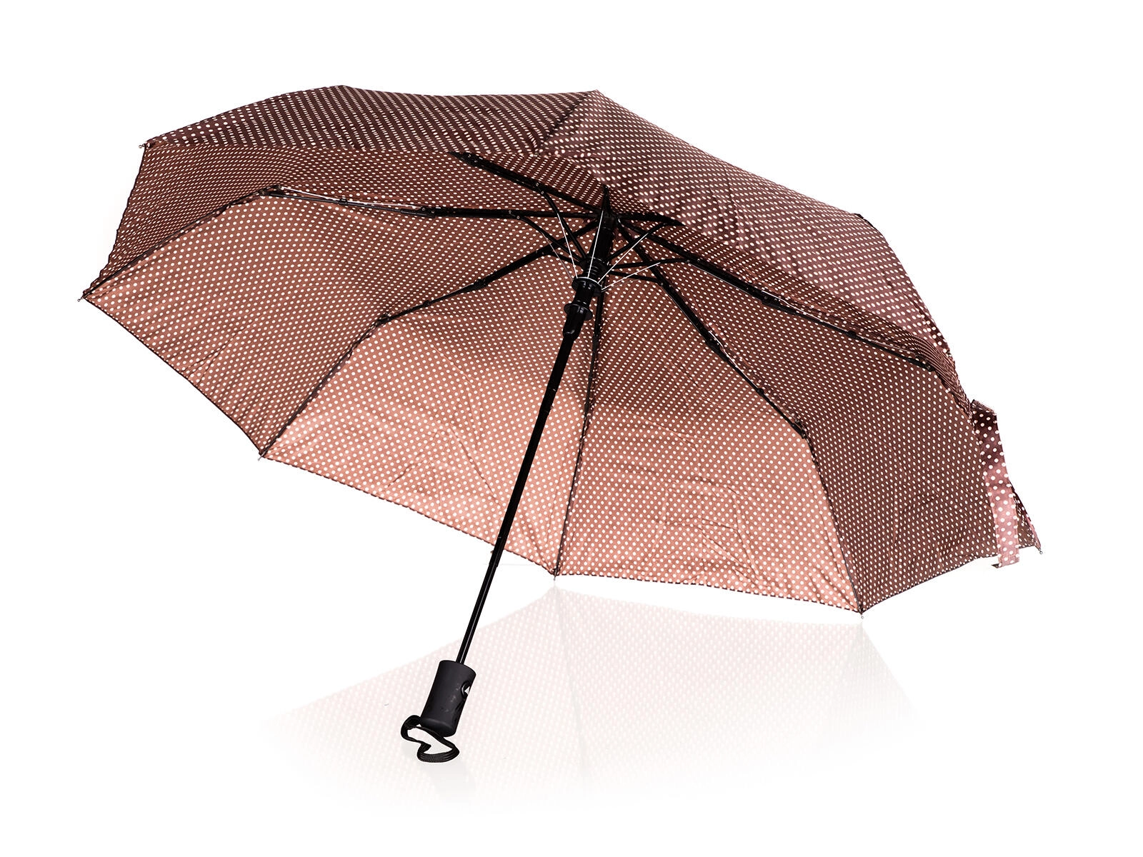 Stijlvolle opvouwbare paraplu met een diameter van 52 cm in elegant bruin met witte stippen biedt betrouwbare bescherming tegen regen en zon. Dankzij het compacte formaat is hij ideaal voor in handtas of rugzak, automatisch openen zorgt voor comfortabel gebruik en de windbestendige constructie verlengt de levensduur. Waterdicht polyester is onderhoudsvriendelijk en droogt snel.