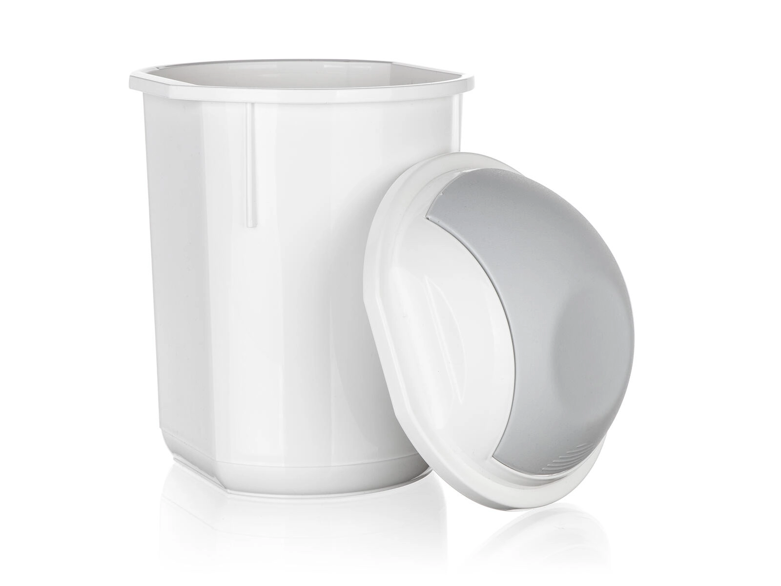 Compacte afvalbak van 4 l in een elegante witte kleur, ideaal voor badkamer, keuken en kantoor. Dankzij het kiepdeksel zorgt hij voor hygiënisch, touchless weggooien, beperkt geurtjes en houdt de inhoud uit het zicht. Duurzaam kunststof is makkelijk schoon te maken en de ruimtebesparende afmetingen besparen plaats.