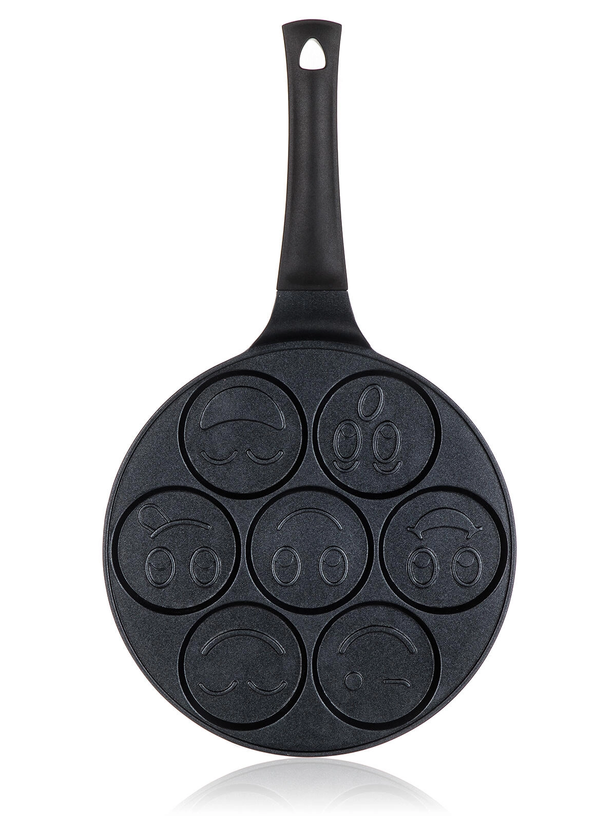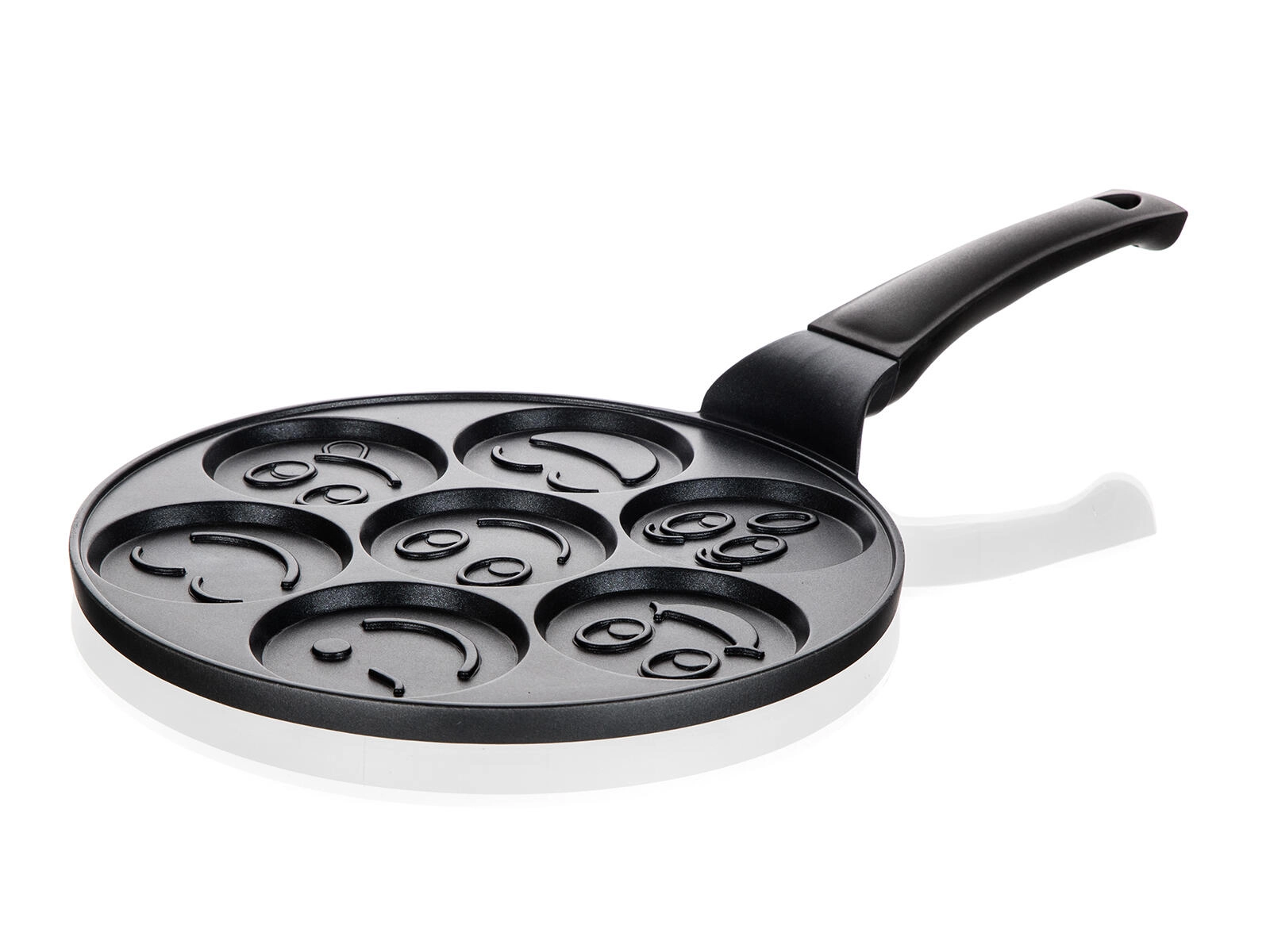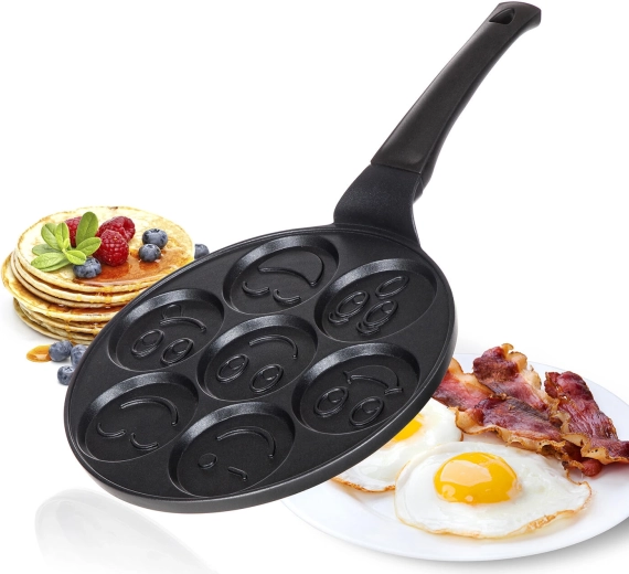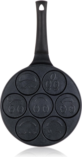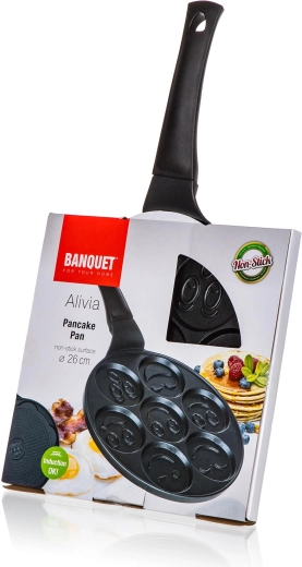 De ALIVIA Smile pannenkoekenpan maakt van elk ontbijt een feestje. Zeven ronde kuiltjes met een diameter van 8 cm en reliëfmotieven zorgen voor perfect gevormde pannenkoeken en eieren met een glimlach. Gegoten aluminium garandeert snelle en gelijkmatige verhitting, terwijl de hoogwaardige antiaanbaklaag het omdraaien en reinigen vergemakkelijkt.