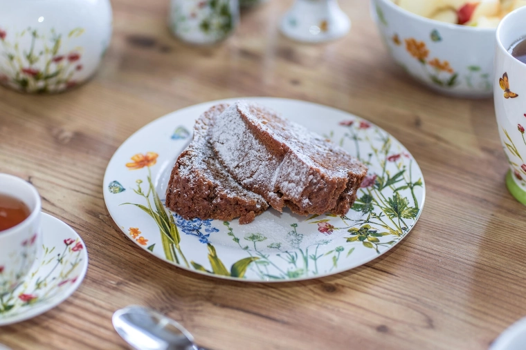 Geniet stijlvol van je desserts. Het Meadow-dessertbord met een kleurrijk bloemenpatroon en delicate vlinderillustraties verlevendigt zowel het dagelijkse tafelen als feestelijke momenten. De universele maat van 19 cm is ideaal voor taarten, gebak en kleine hartige hapjes.