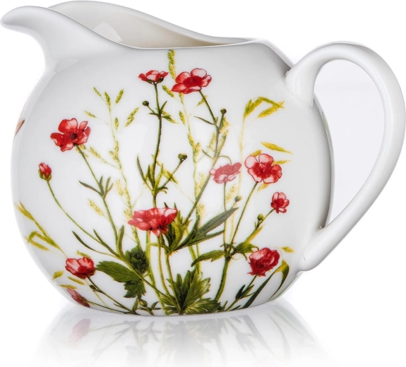 Elegante keramische melkkan met een inhoud van 250 ml en een subtiele bloemenprint MEADOW, een perfecte aanvulling bij het serveren van koffie en thee. Dankzij de praktische tuit schenkt hij schoon en comfortabel, is geschikt voor vaatwasser en magnetron en laat zich eenvoudig combineren met andere items uit dezelfde collectie voor een uniforme en stijlvolle tafel.
