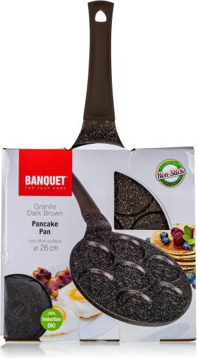 Deze hoogwaardige pannenkoekenpan van gegoten aluminium met een dubbele antiaanbaklaag in bruin marmerdesign is ideaal voor een snelle en gezonde bereiding van pannenkoeken, rösti of eieren. Zeven ronde vormen met smiley-reliëf maken van elke ochtend een feestje en zorgen voor mooi ronde porties.