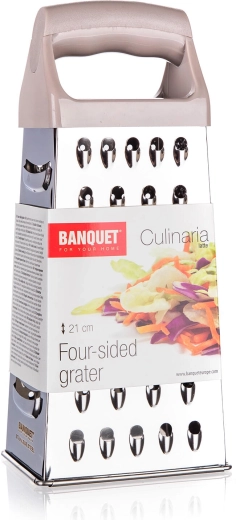 Praktische vierzijdige piramidevormige rasp van roestvrij staal met een hoogte van 21 cm voor het eenvoudig raspen van groenten, kaas en fruit. Biedt een stabiele constructie, een comfortabele kunststof handgreep in latte-kleur en eenvoudig onderhoud.