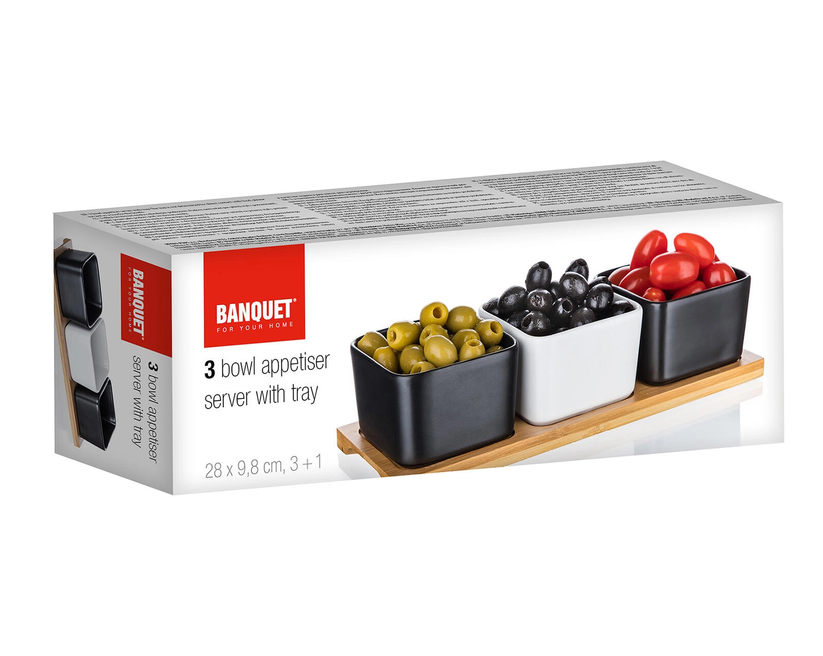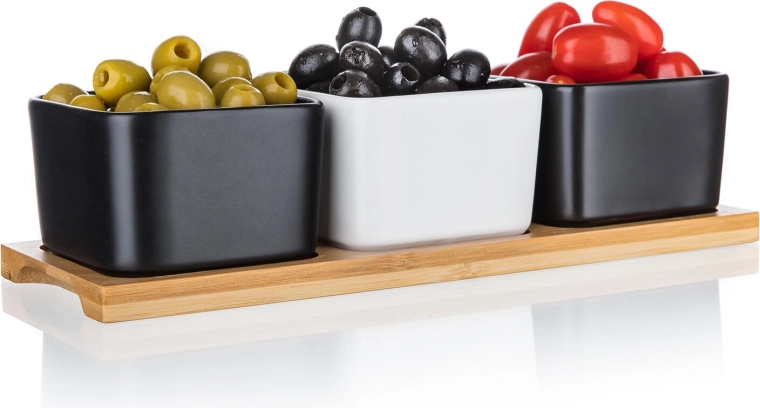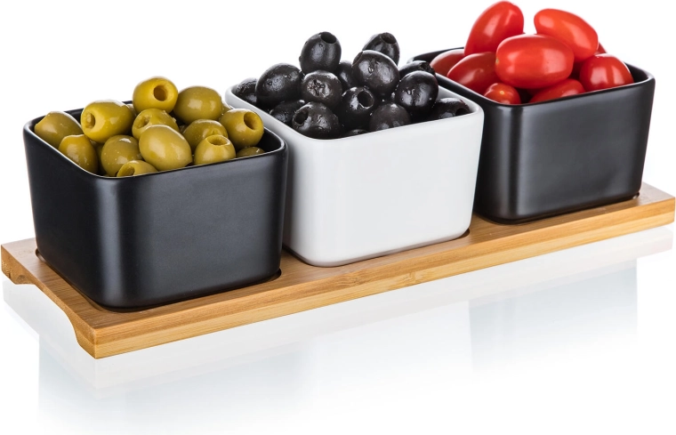 Elegante set van drie vierkante porseleinen schaaltjes op een bamboe dienblad, ideaal voor het serveren van dips, sauzen, olijven of nootjes. De combinatie van 2 zwarte en 1 witte schaal geeft een moderne look aan je tafel; eenvoudig onderhoud in de vaatwasser en gebruik in de magnetron zorgen voor praktisch dagelijks gebruik.