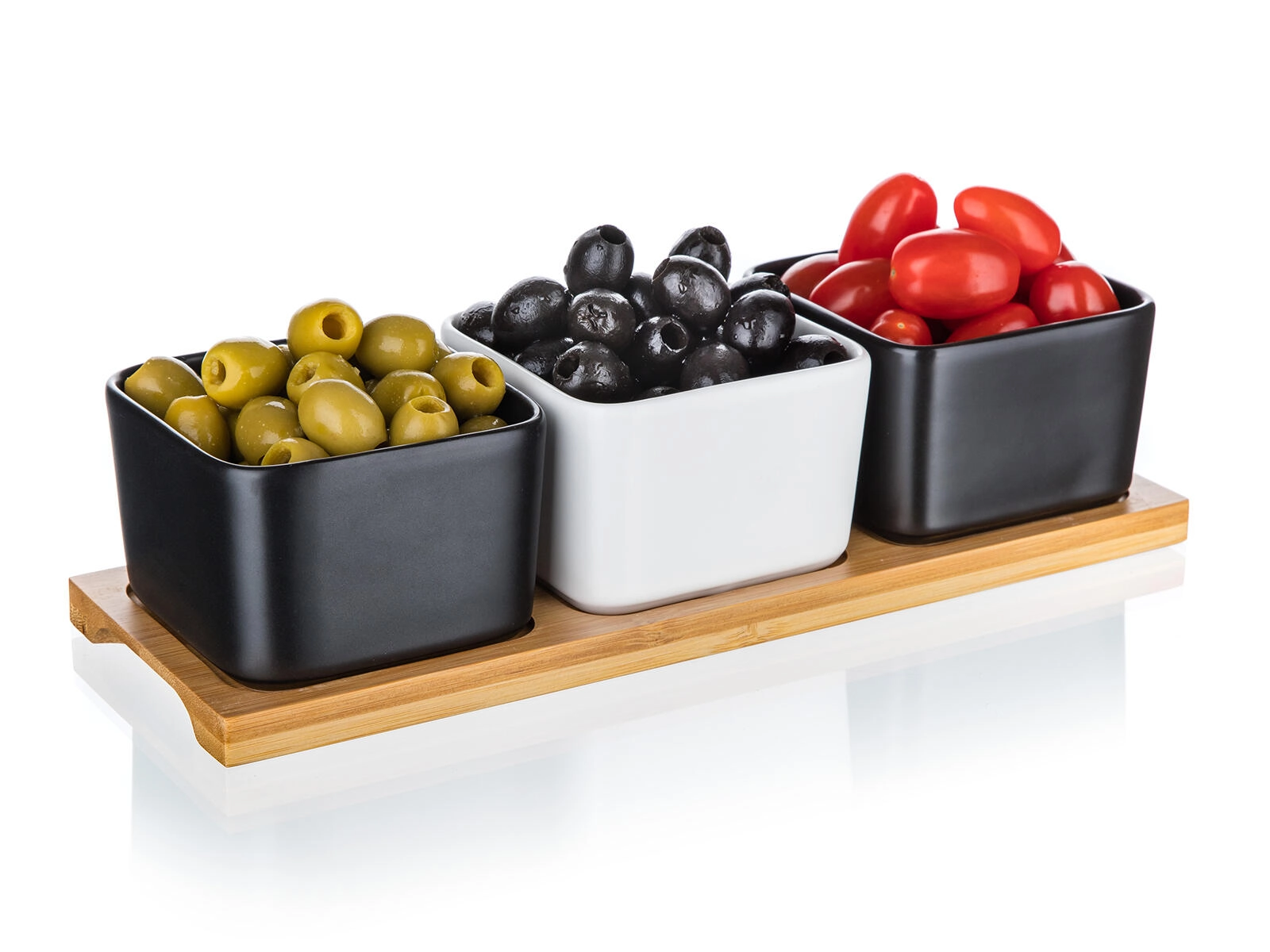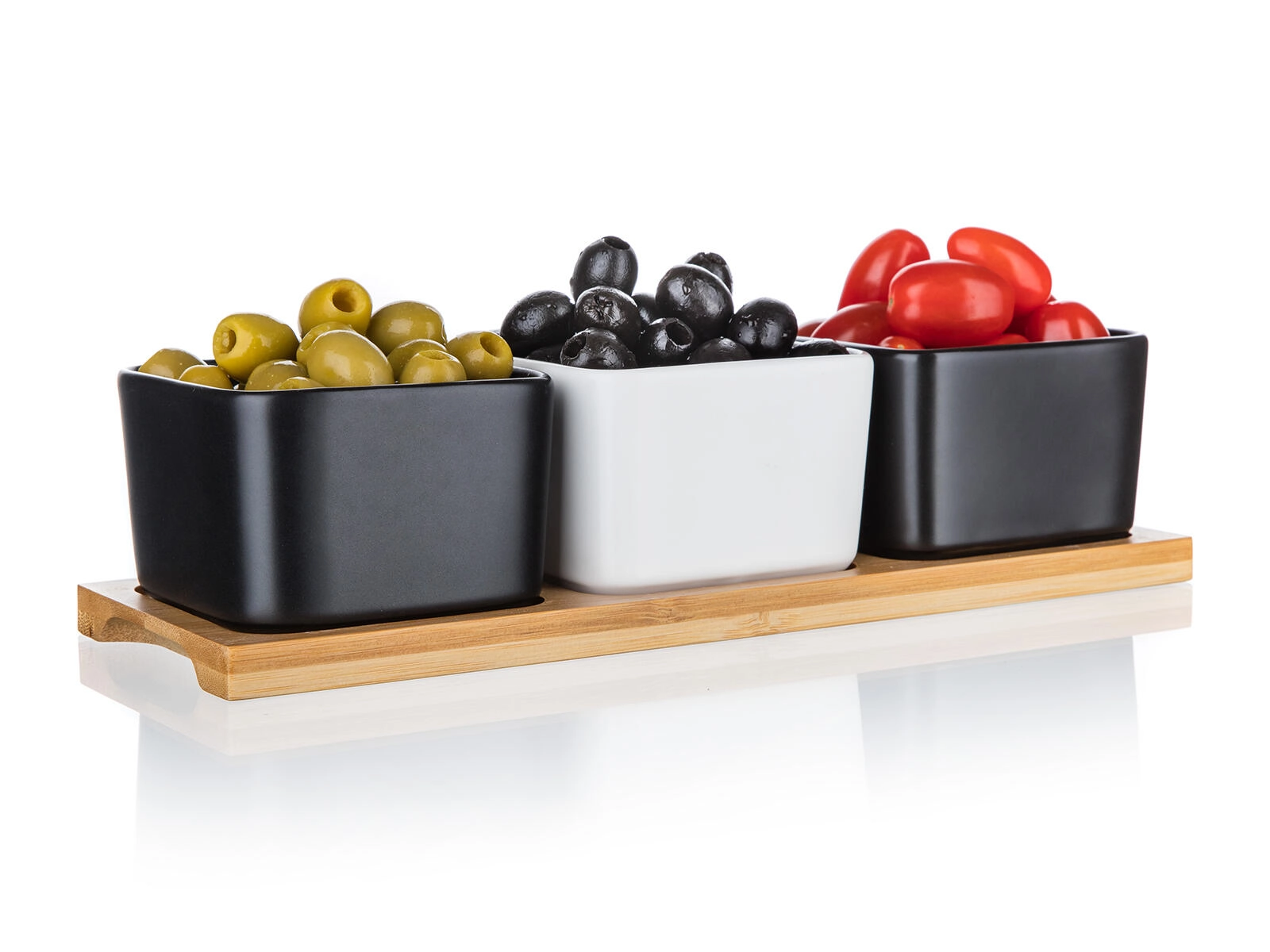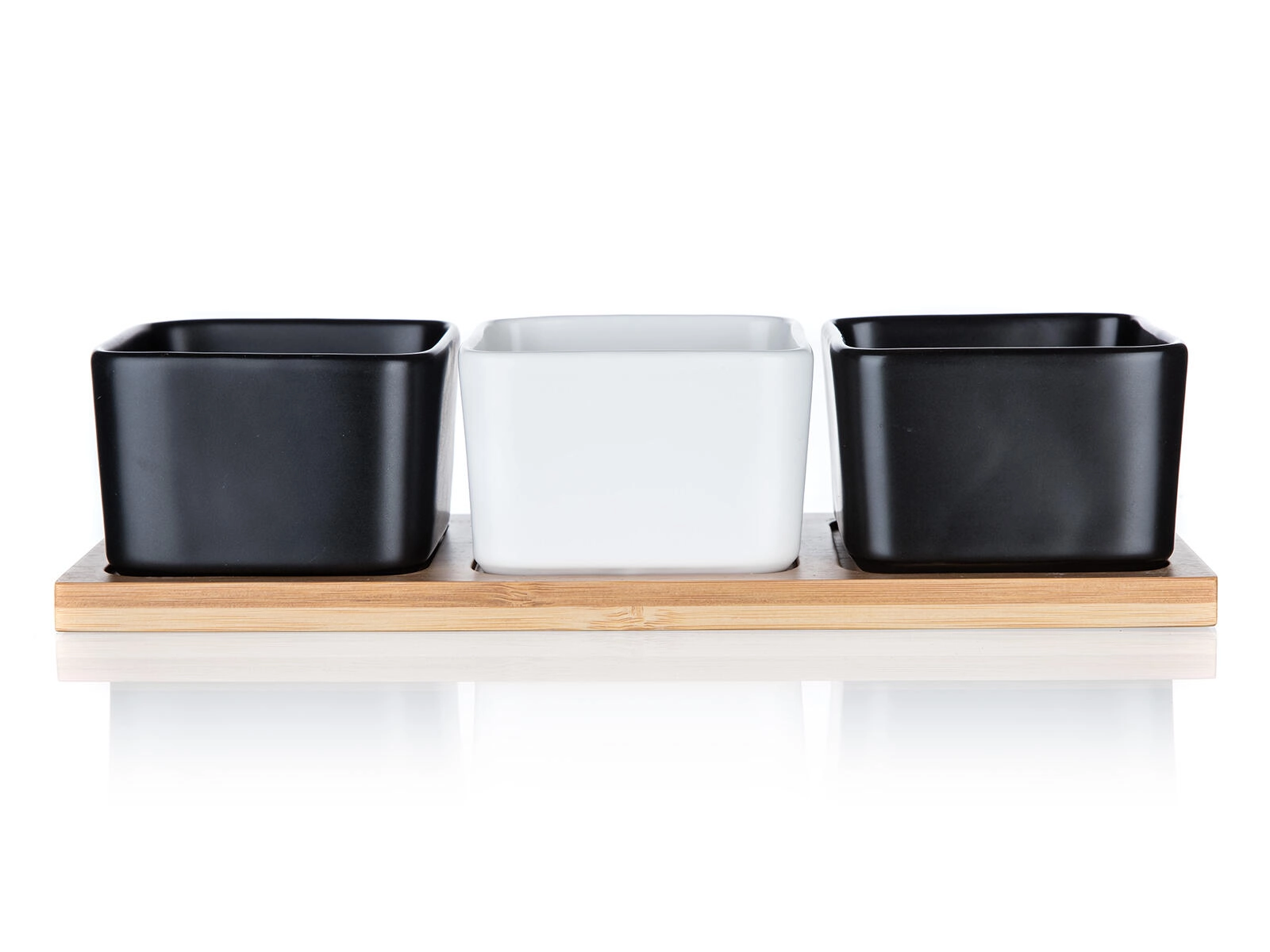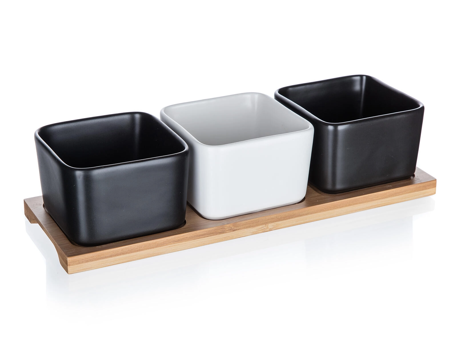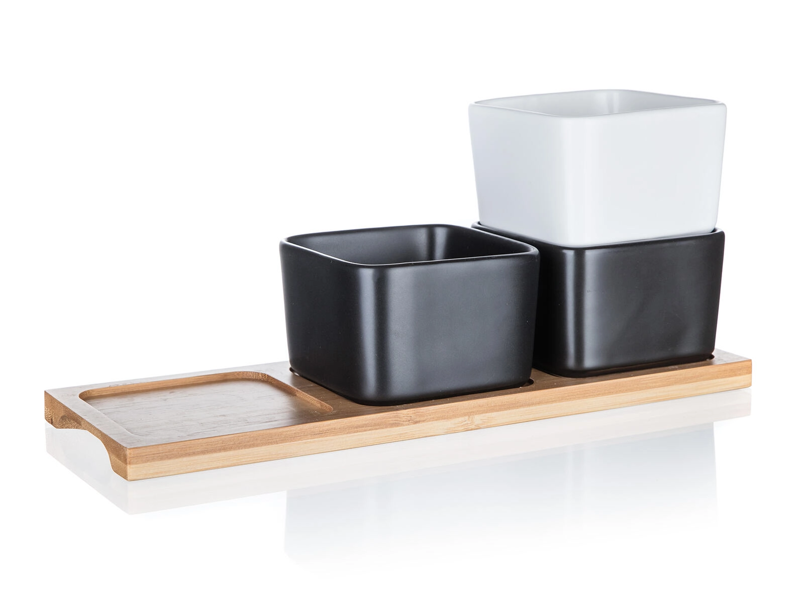 Drie vierkante schaaltjes in zwart-wit contrast op een natuurlijk bamboe dienblad geven je tafel een moderne en natuurlijke uitstraling.