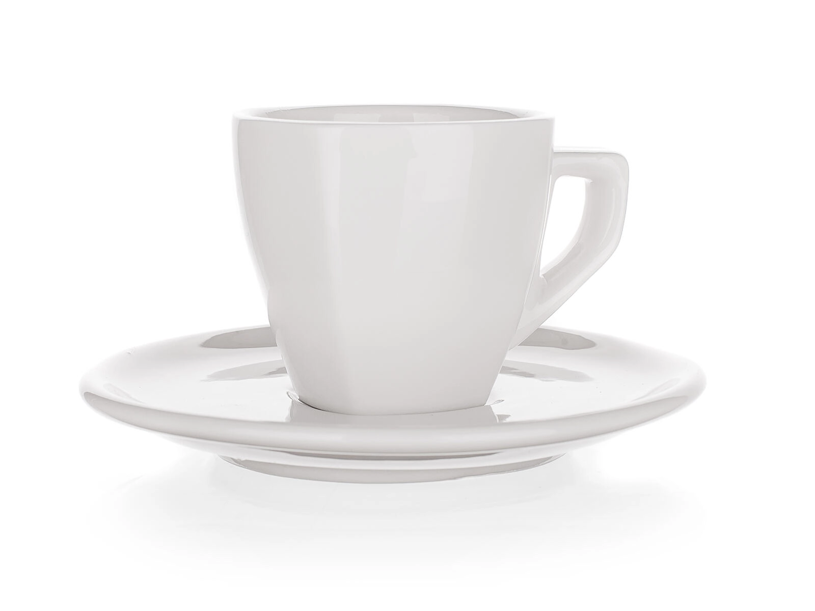 Elegante porseleinen kop met schotel ALBA met een inhoud van 60 ml in een modern vierkant design, ideaal voor espresso. De hoogwaardige witte glazuur zorgt voor duurzaamheid en eenvoudig onderhoud. Geschikt voor de vaatwasser en voor horecagebruik.