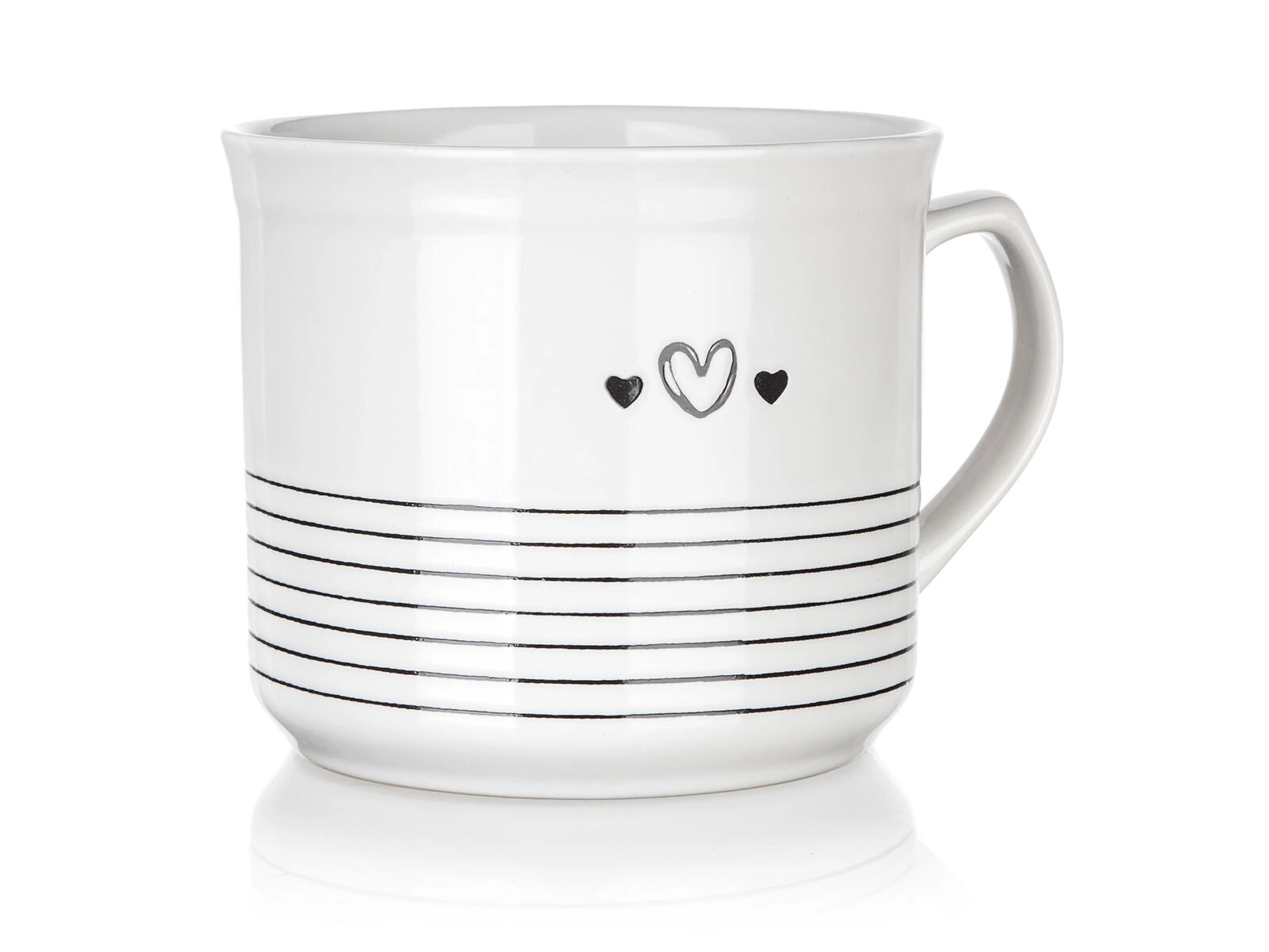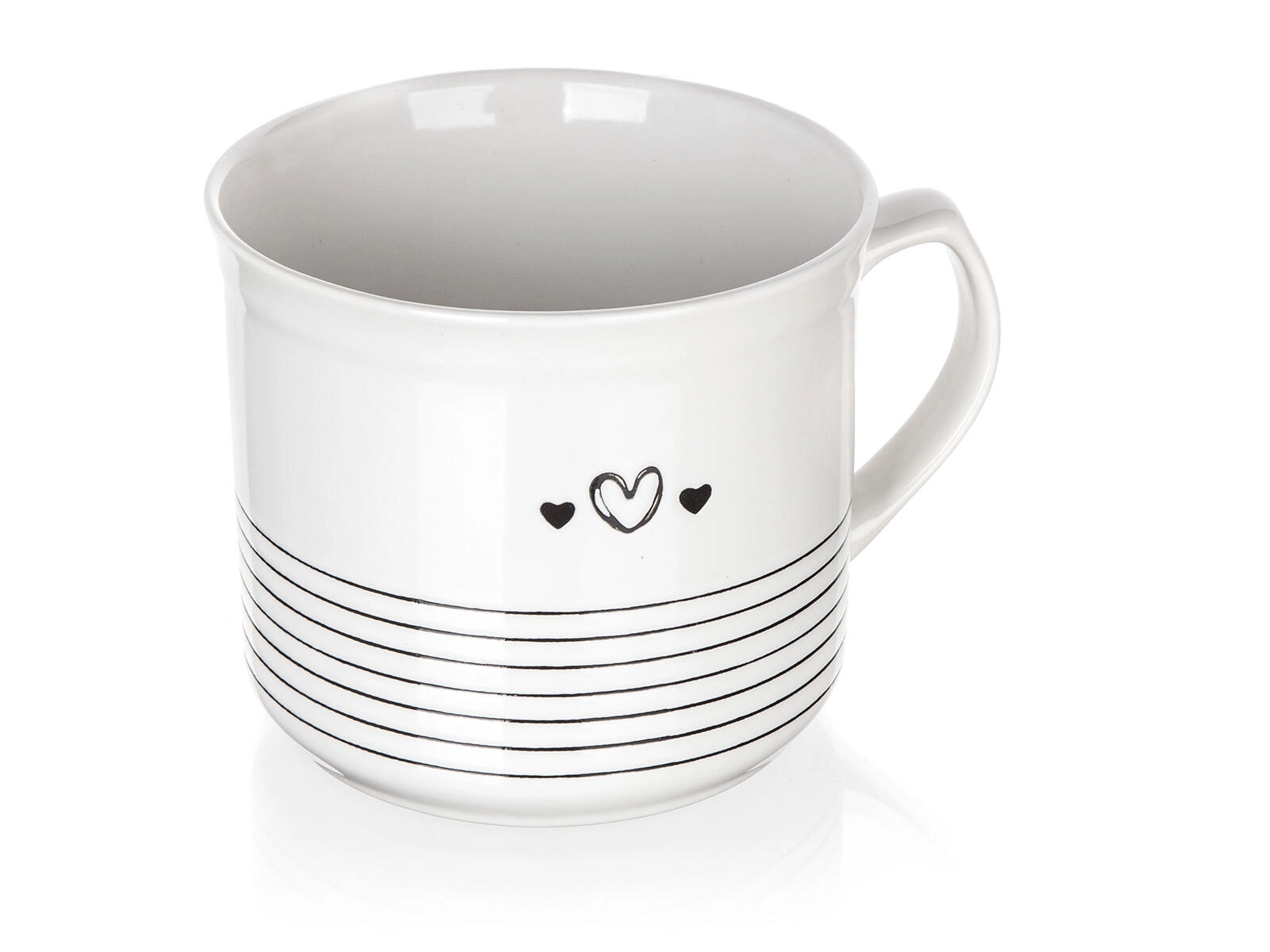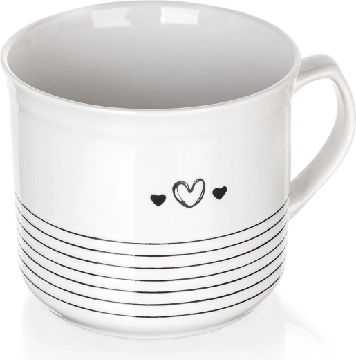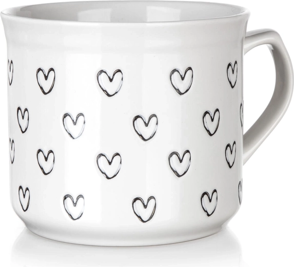 Geniet in stijl van je favoriete warme dranken met deze grote keramische mok met hartjes in penstijl. Dankzij de inhoud van 660 ml is hij perfect voor een lange ochtendkoffie of een stevige kruidenthee. De glanzende glazuurlaag en de zuiver witte basis met zwarte details geven je keuken tijdloze elegantie.