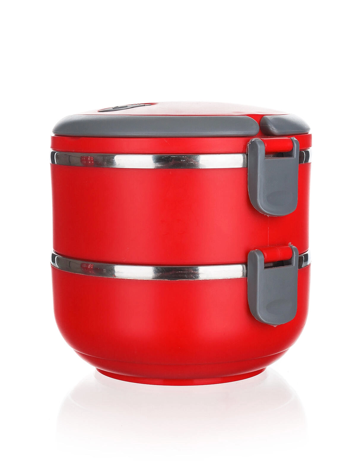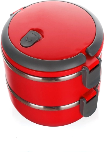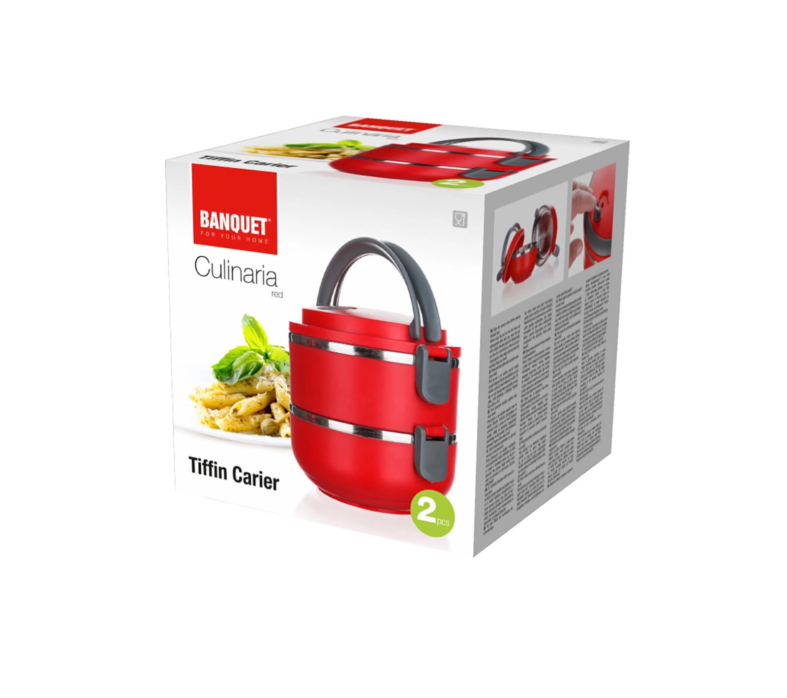 Praktische tweelaagse etensdrager CULINARIA Red, ideaal voor onderweg, op het werk en naar school. Dankzij twee gescheiden kommen met een totaalvolume van 1,1 l blijft het eten overzichtelijk verdeeld, veilig afgesloten en beter thermisch geïsoleerd door de roestvrijstalen inzetstukken. Stevige zijklemmen en een inklapbaar handvat voor gemakkelijk dragen zorgen voor comfort zonder morsen.
