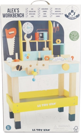 De houten kinderwerkbank ALEX van LE TOY VAN biedt alles wat jonge reparateurs nodig hebben voor realistisch spel. Dankzij de stevige afwerking van gecertificeerd FSC-hout en niet-giftige verven is hij veilig, duurzaam en milieuvriendelijk. Inclusief ingebouwde cirkelzaag, meetlat en werkbankschroef, een bovenplank met haken en een onderste opbergruimte voor extra uitrusting.