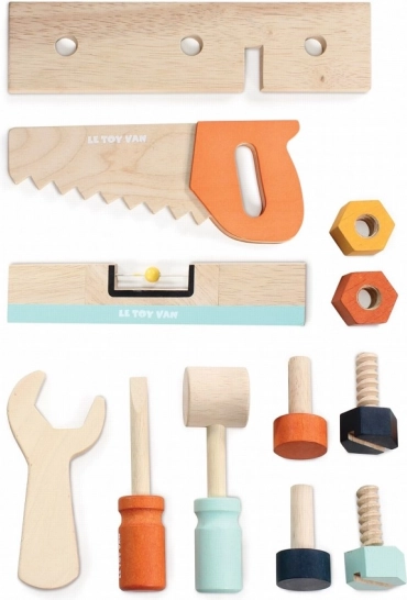De uitgebreide set van 12 houten accessoires is ideaal voor kleine kinderhanden: zaag, hamer, schroevendraaier, moersleutel, waterpas, 2 schroeven, 2 bouten, 2 spijkers en een plankje. Het spel bevordert creativiteit, logisch denken en motorische vaardigheden. De werkbank heeft diverse onderscheidingen ontvangen en behoort tot de bekroonde collectie Auto’s & Bouw van LE TOY VAN.