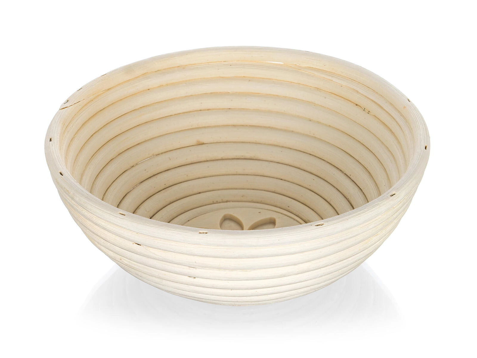 Ronde rijsmand van natuurlijk riet (rotan) met een diameter van 21 cm en een bloemendecor op de bodem, ideaal voor het laten rijzen van brooddeeg. De spiraalvormige groeven ondersteunen een gelijke fermentatie en creëren een aantrekkelijk patroon op de korst. Licht, ademend en eenvoudig te onderhouden – gewoon afnemen met een vochtige doek.